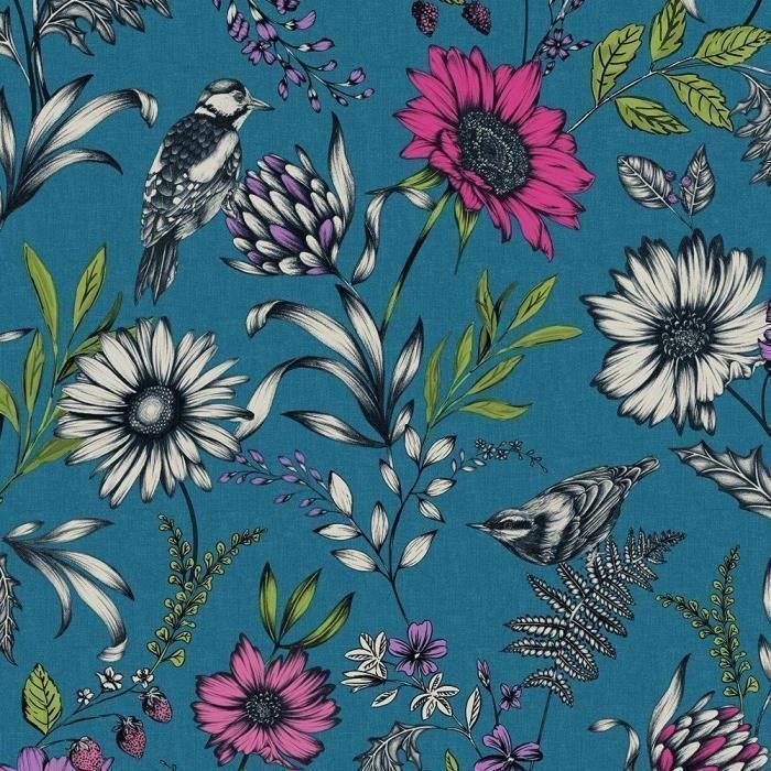 Papier Peint Holden Decor Motir Fleuri Oiseau Dore Metalise Bleu